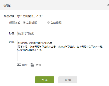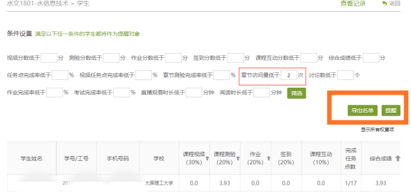 通过超星平台“统计”-“教学预警”,设置预警条件(如:章节访问量低于