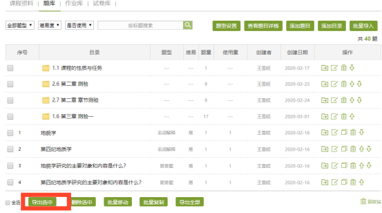 可将每次的章节测验题及答案在平台的“资料”-“题库”中生成word或者