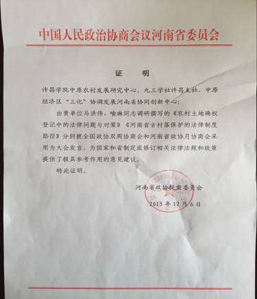 近日,bat365官网应用性科研成果又传喜讯。由马克思主义学院(中原农村发展研究中心)研究人员撰写的咨政报告《农村土地确权登记中的法律问题与对策》被河南省政协选中后,作为专题发言提案参加了全国政协和国务院共同召开的双周协商座谈会。根据全国政协的文件精神,座谈会成果将及时向中共中央、国务院及有关部门反映。采用证明内容如下:“由农村发展研究中心马洪伟、喻琳撰写的《农村土地确权登记中的法律问题与对策》被全国政协双周协商会采用为大会发言,为国家和省制定或修订相关法律法规和政策提供了极具参考作用的的意见建议。”